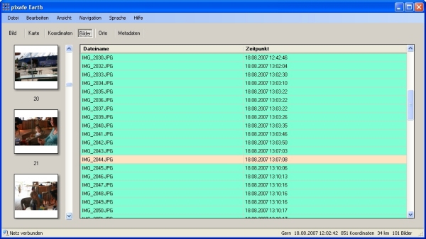In der Bilder-Ansichte werden die Dateinamen der Bilder des eingelesenen Bildverzeichnisses angezeigt. Wie auch bei der Anzeige der Koordinaten gibt es eine Angabe zum Bildzeitpunkt, der aus den EXIF Daten der eingelesenen Bilder ermittelt wurde.