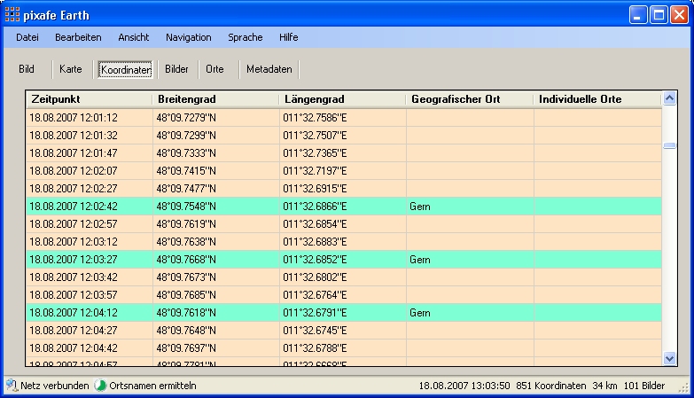 In der Koordinaten-Ansicht werden die eingelesenen GPS-Koordinaten angezeigt. Diese Daten stammen entweder aus den eingelesenen GPS-Dateien (*.log und *.gpx) oder aus Bildern, die in ihren EXIF-Daten über GPS-Informationen verfügen. In den in der Koordinatentabelle angezeigten Datensätzen ist auch eine Angabe zum Bilddatum (Zeitpunkt) enthalten. Koordinatenangaben von den selbst definierten Orten werden ohne Zeitpunkt angezeigt.