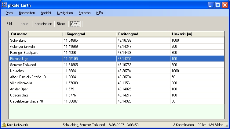 Über das Kontextmenü kann man sich die zum Ort zugehörige Karte oder Satellitenbild anzeigen lassen, den Ort über den zugehörigen Dialog bearbeiten, sowie den Ort löschen oder umbenennen.