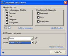 Mit diesem Dialog können Objekte (Personen, Schlagworte, Orte, Kategorien) aus der Datenbank gelöscht werden, die nicht unebedingt benötigt werden. Außerdem können EXIF Daten für Kameramarke und Modell korrigier werden.