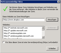 Wählen Sie bitte Hinzufügen und im nachfolgenden Dialog ebenfalls Hinzufügen und Schließen für die Webseiten des Cloudproviders.