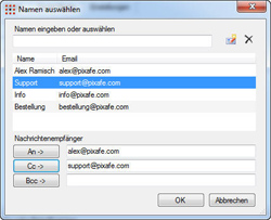 die Adressaten (auch Cc und Bcc) aus dem pixafe Transfer Adressbuch auswählen,