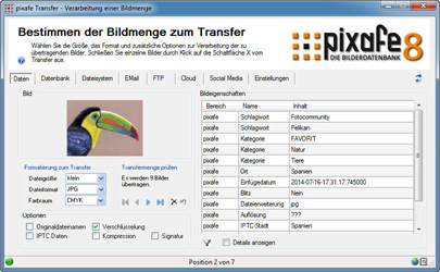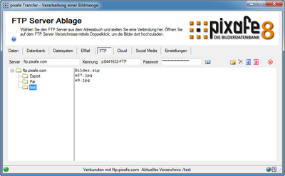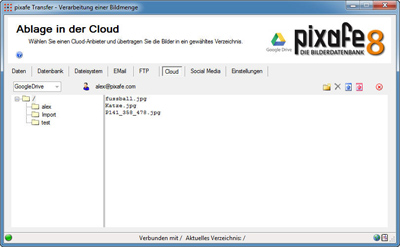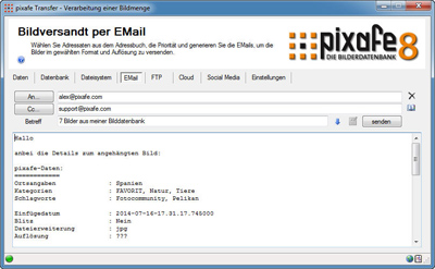 Mit pixafe Transfer können Sie Ihre Bilder direkt aus der Datenbank heraus ganz einfach weitergeben. Es gibt dafür verschiedene Kanäle - so können Sie die ausgewählten Bilder per Email versenden, in unterschiedlichen Cloud-Speichern (wie Google Drive oder DropBox ) ablegen, in sozialen Netzwerken (wie facebook oder tumblr ) an Pinwände hängen, auf FTP Server hochladen, und auf lokale oder entfernte Netzwerkverzeichnisse kopieren.