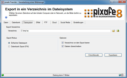 Zielsysteme (Dateisystem, Email, FTP, ...) übertragen werden. Sofern pixafe Transfer nur für ein