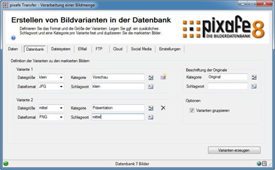 In diesem Reiter können zu den markierten Bildern der Transfermenge Varianten in unterschiedlicher Auflösung und Format erstellt und optional gruppiert in der Datenbank abgelegt werden.