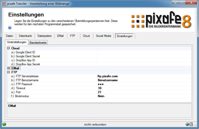 Zu jedem Zielsystem können auf dem betreffenden Reiter Datenbank, Dateisystem, EMail, FTP Server, Cloud und soziales Netzwerk konkrete Einstellungen für den einzelnen Transport vorgenommen werden, die für den nächsten Programmlauf gespeichert werden. Darüberhinaus können zusätzliche System-spezifische Detail-Einstellungen können im letzten Reiter Einstellungen vorgenommen werden.