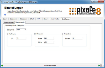 Die Vorgabewerte legen fest, was unter den im Reiter Daten verwendeten Vorgabewerten für Dateigröße und Auflösung zu verstehen ist.