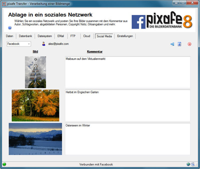 Es ist für Unternehmen genauso wie für Privatanwender sehr interessant, direkt aus der Datenbank heraus Bilder in soziale Netzwerke zu laden (posten). Aus diesem Grund bietet pixafe Transfer die Anbindung an soziale Netzwerke wie beispielsweise Facebook, Twitter oder Flickr.